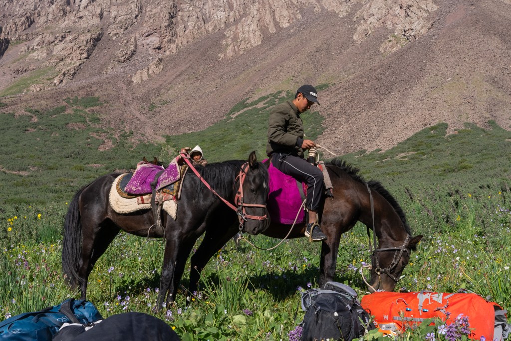 A hired horseman and his two children to help get our stuff into the mountains. Meeting Jenishbek and his family, now this is what I came here for. All our gear loaded into a trailer full of horse shit and me and Maria with it. Chugging along a 4WD track (that’s generous description) to meet a seven year old with four horses in tow. All our worldly possessions haphazardly tied onto them we headed up the valley into the unknown.